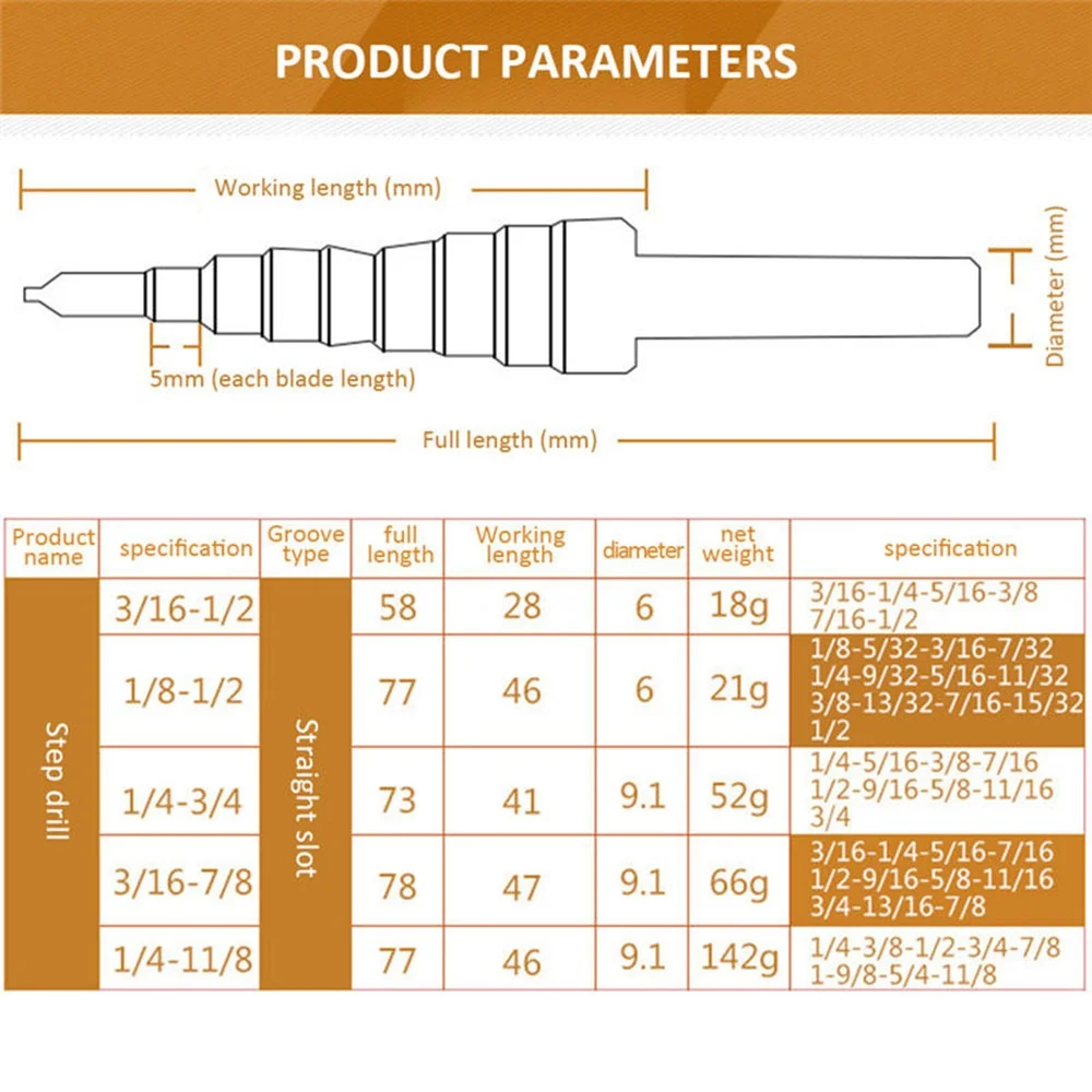 - O design de duas flautas conduz cortes mais rápidos, suaves e limpos, cada etapa é claramente etiquetada com o diâmetro de profundidade nos degraus