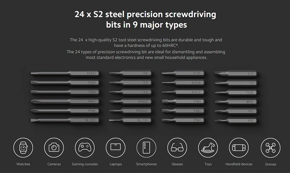 Os 24 tipos de brocas de aparafusamento de precisão são ideais para desmontar e montar a maioria dos eletrônicos padrão e novos pequenos eletrodomésticos.