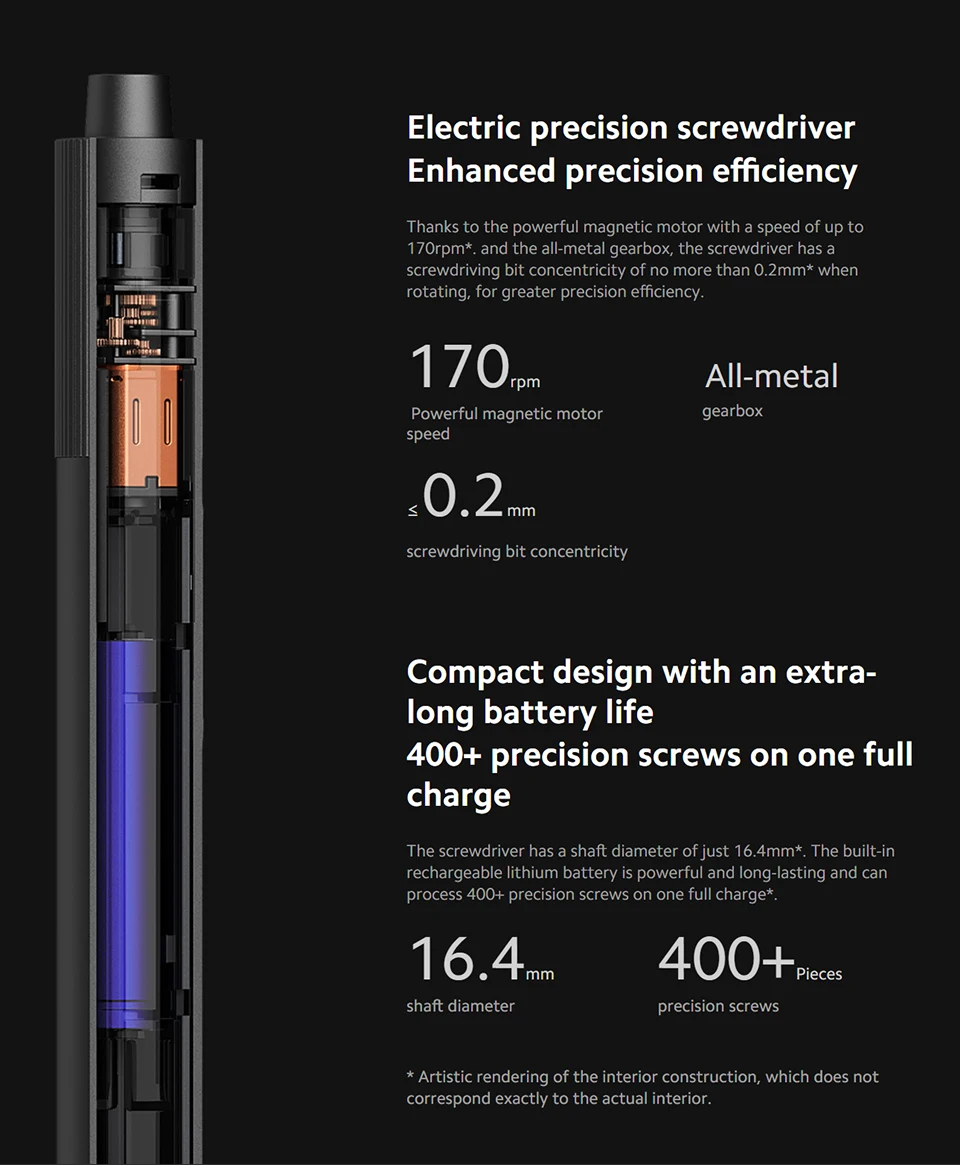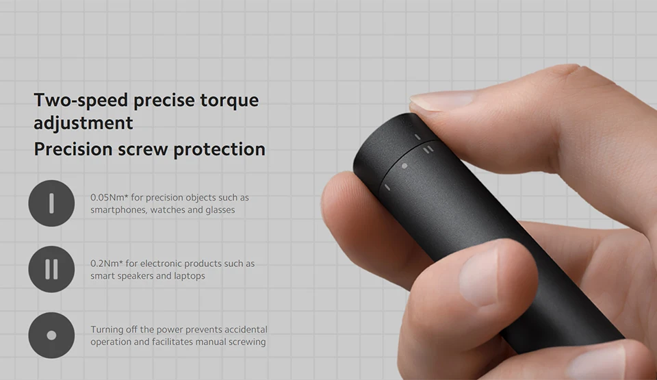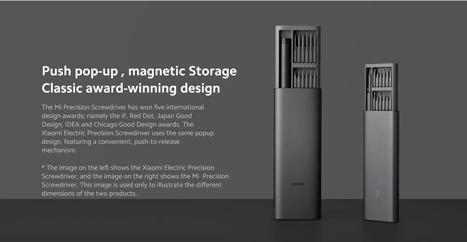 A chave de fenda Mi Precision ganhou cinco prêmios internacionais de design; ou seja, os prêmios iF, Red Dot, Japan Good Design, IDEA e Chicago Good Design.A chave de fenda elétrica de precisão Xiaomi usa o mesmo design pop-up, apresentando um mecanismo conveniente de empurrar para liberar.