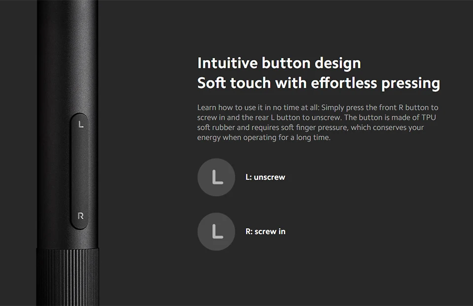 Aprenda como usá-lo rapidamente: basta pressionar o botão R frontal para aparafusar e o botão L traseiro para desparafusar.O botão é feito de borracha macia TPU e requer pressão suave dos dedos, o que economiza energia ao operar por um longo tempo.