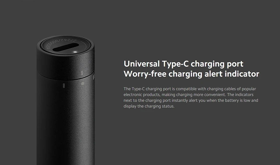 A porta de carregamento Tipo C é compatível com cabos de carregamento de produtos eletrônicos populares, tornando o carregamento mais conveniente.Os indicadores próximos à porta de carregamento alertam você instantaneamente quando a bateria está fraca e exibem o status de carregamento.